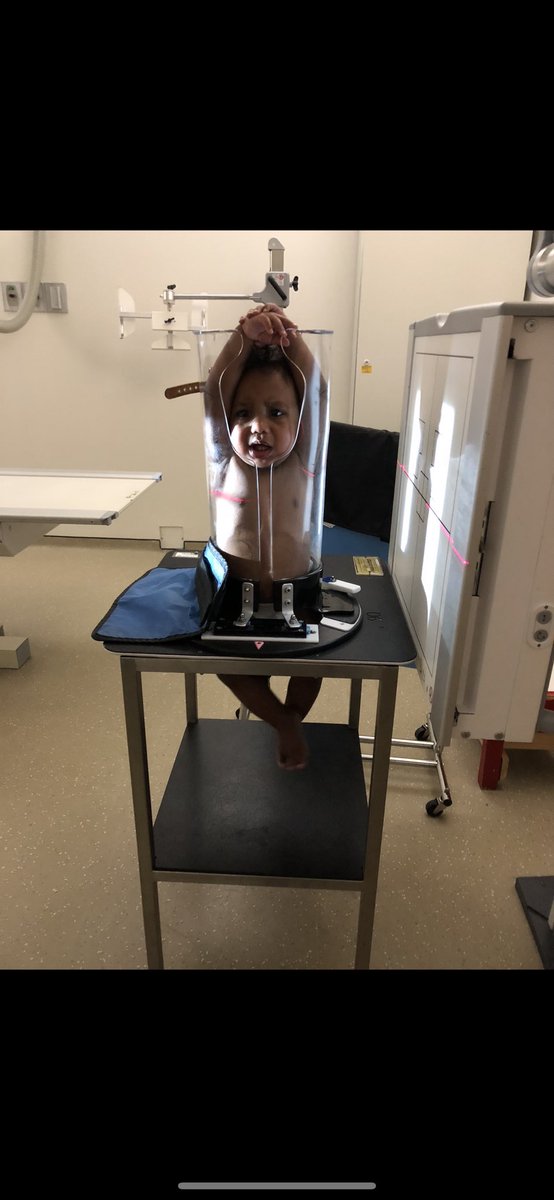 The contraption hes in is called a Pigg O Stat. Not all x-rays are the same but most pose little exposure to the uterus and developing a fetus. Luckily most hospitals realize that kids have different needs than adults.